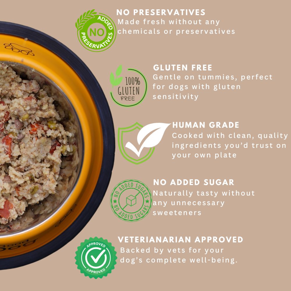 A nutritious, light, and dog-safe recipe, Quinoa and Rice Delight combines two easily digestible grains that support energy, digestion, and overall health. It can be served plain or with lean proteins like chicken. A superfood-powered meal with tender chicken, fluffy rice, and nutrient-rich quinoa. Packed with protein, fiber, and essential minerals to keep your pet strong, active, and full of vitality.